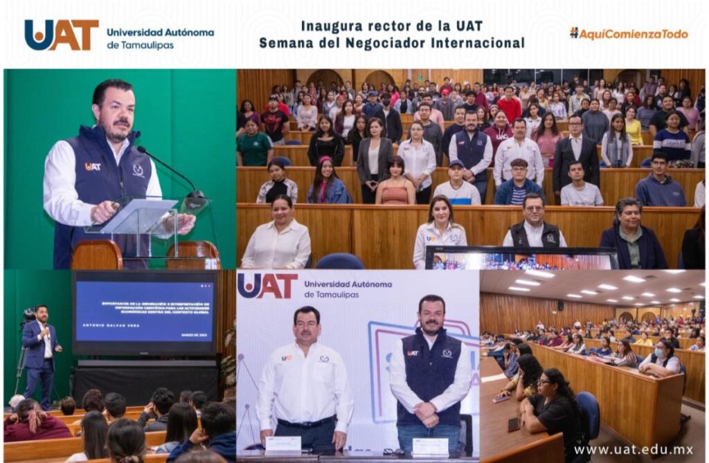 El C. P. Guillermo Mendoza Cavazos, rector de la Universidad Autónoma de Tamaulipas (UAT), inauguró la Semana del Negociador Internacional, organizada por la Facultad de Derecho y Ciencias Sociales Victoria (FDCSV), evento en el que participan especialistas nacionales y extranjeros.
