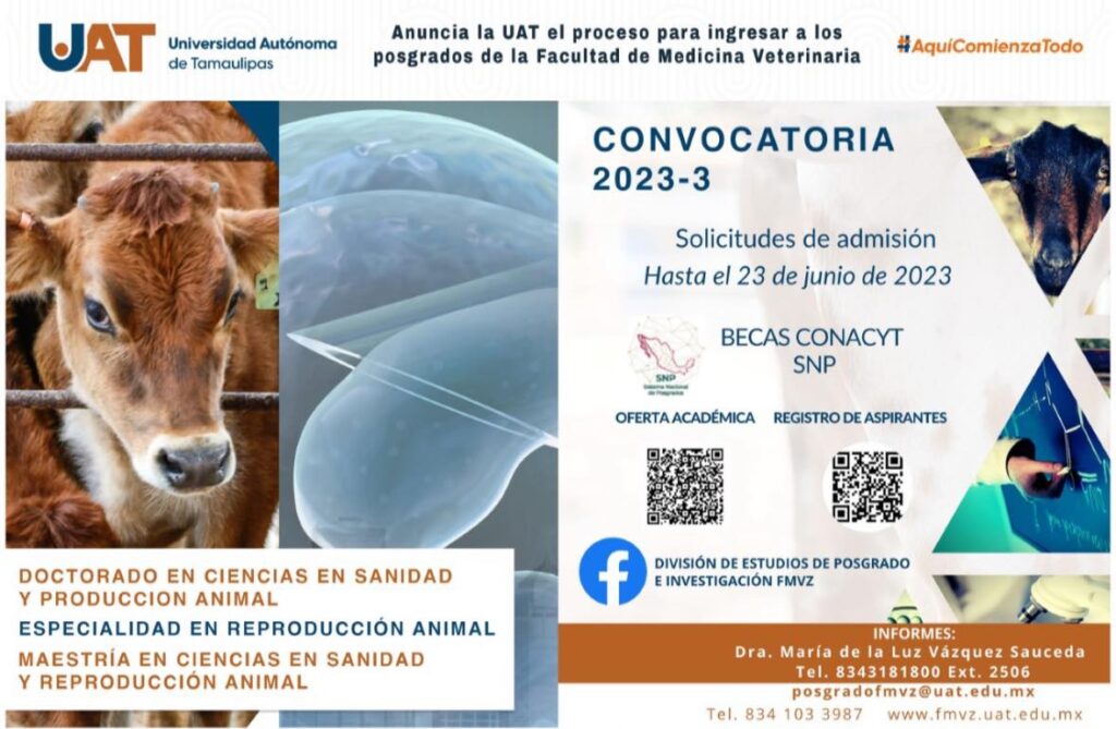 La Universidad Autónoma de Tamaulipas, a través de la Facultad de Medicina Veterinaria y Zootecnia Dr. Norberto Treviño Zapata (FMVZ-UAT), tiene abierto el proceso de admisión de los programas de posgrado, cuya fecha límite para la recepción de solicitudes es el 23 de junio de 2023.